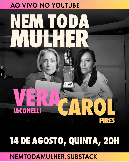 Contei aqui que estou com uma newsletter nova, a NEM TODA MULHER, com a psicanalista e diva Vera Iaconelli. Já estamos na terceira edição e vamos fazer nossa primeira LIVE para falar sobre o tema dos nossos primeiros textos: maternidade, sexo e solidão nas redes.
